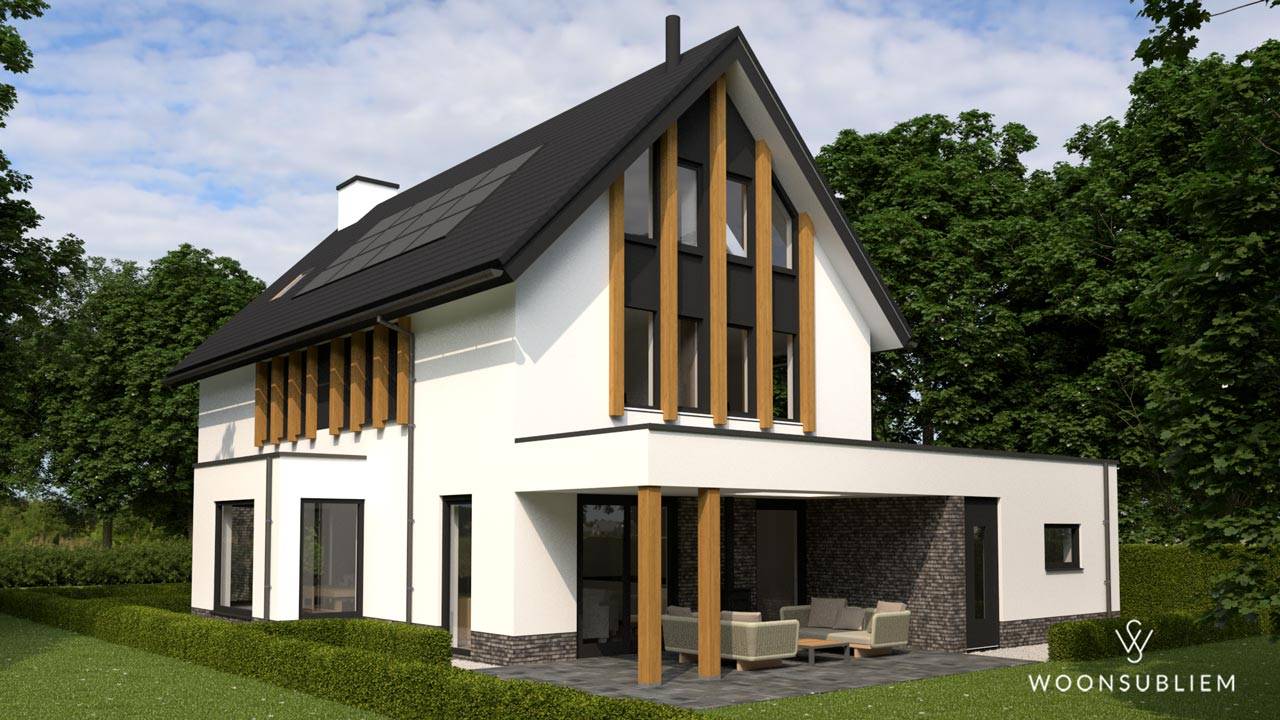 De woning bestaat uit twee bouwlagen met kap. De kap wordt uitgevoerd met een keramische pan in een donkere kleurstelling. Aan de achtergevel loopt de uitbouw (bestaande uit een berging met bijkeuken) door in de veranda. Hier is het heerlijk nagenieten op een zomeravond bij de buitenhaard. Door de ruime lichtkoepel is het ook in de ochtend een heerlijke plek om de dag te beginnen.