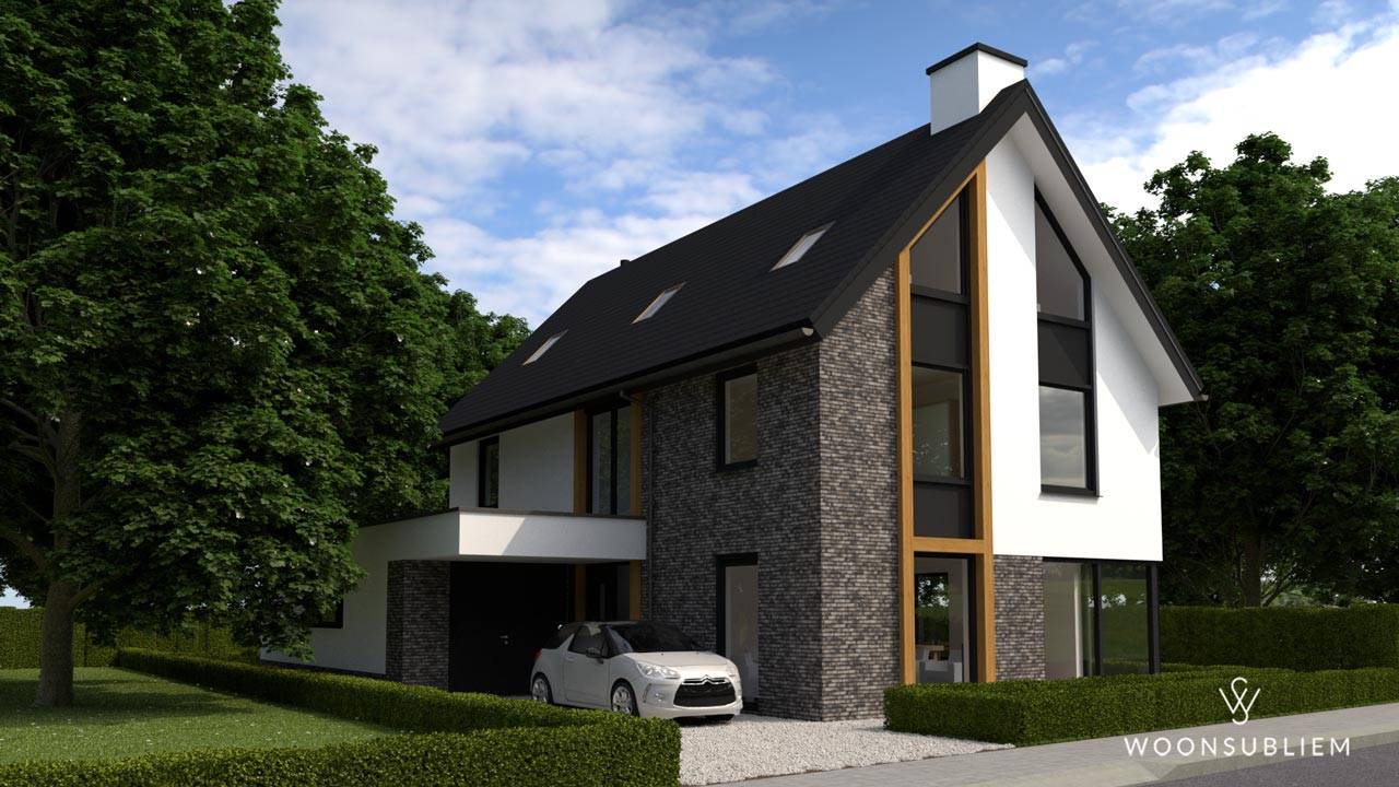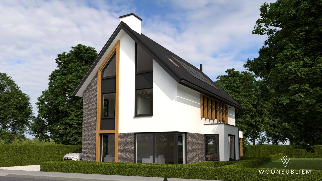 De houten accenten zorgen voor ritme in de gevel en een warme uitstraling. In de voorgevel is gekozen voor een accent in een verticale beweging langs de voorgevel. Hierdoor ontstaat een fraaie verdeling van de voorgevel en spanning in het ontwerp voor de villa in Eerbeek