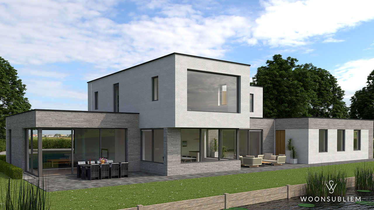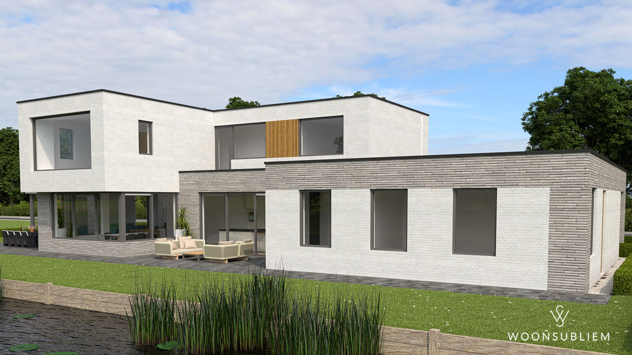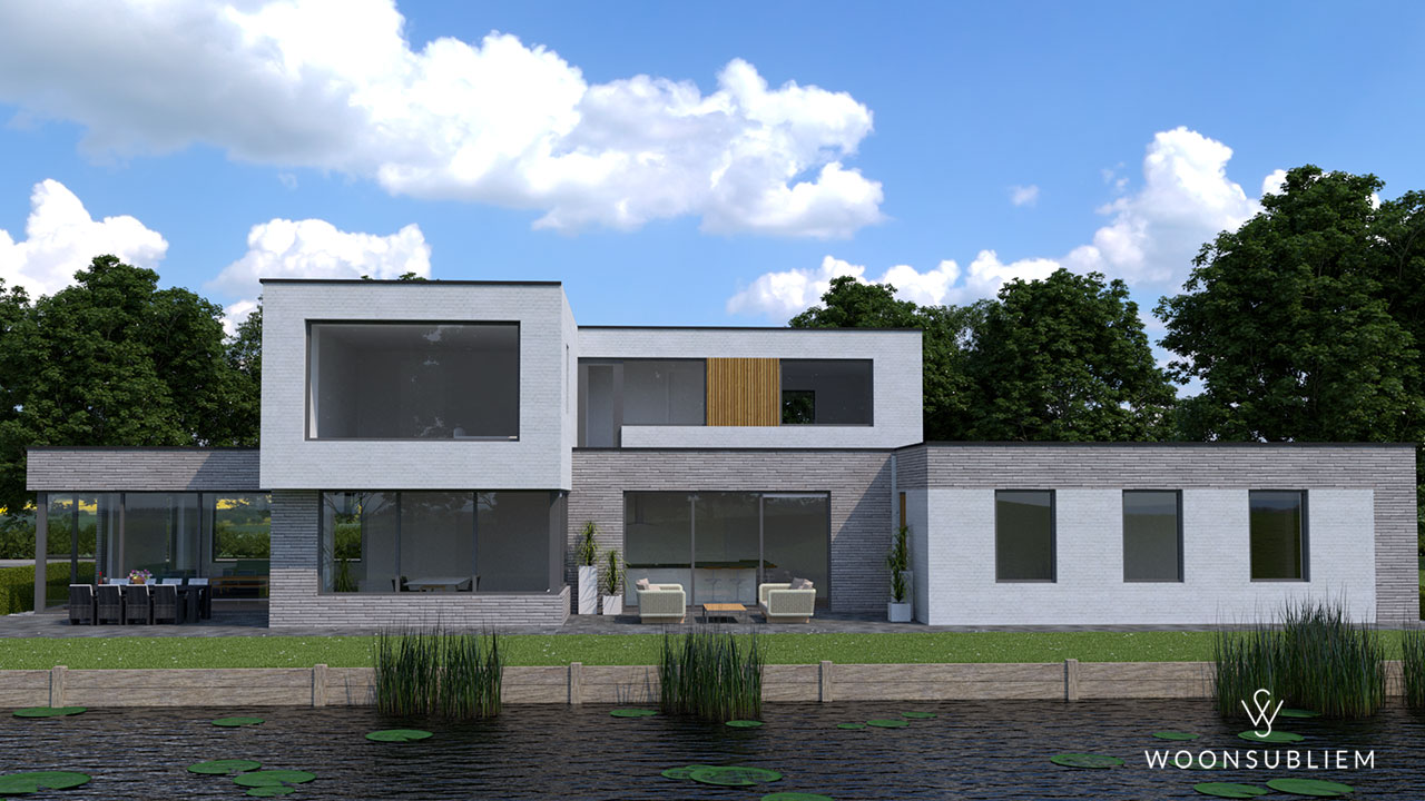 De kavel is gelegen aan een waterpartij, een belangrijke wens van de opdrachtgever was dan ook: genieten van het uitzicht Mede door de vorm van de kavel is er een indeling gekozen om aan de achtergevel van deze kubistische villa maximaal te kunnen genieten van het uitzicht over het water. Een langerekt bouwvolume geeft hiervoor alle mogelijkheden.