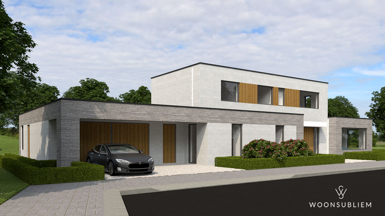 Door toepassing van verschillende materialen en bouwvolumes ontstaat er een spannend lijnenspel. De combinatie van metselwerk en gekeimde gevels geven deze kubistische villa een verrassend vriendelijk uiterlijk. De houtaccenten versterken dit beeld. Het grote schilderijraam op de verdieping kenmerkt de bijzondere plaats van de master bedroom.