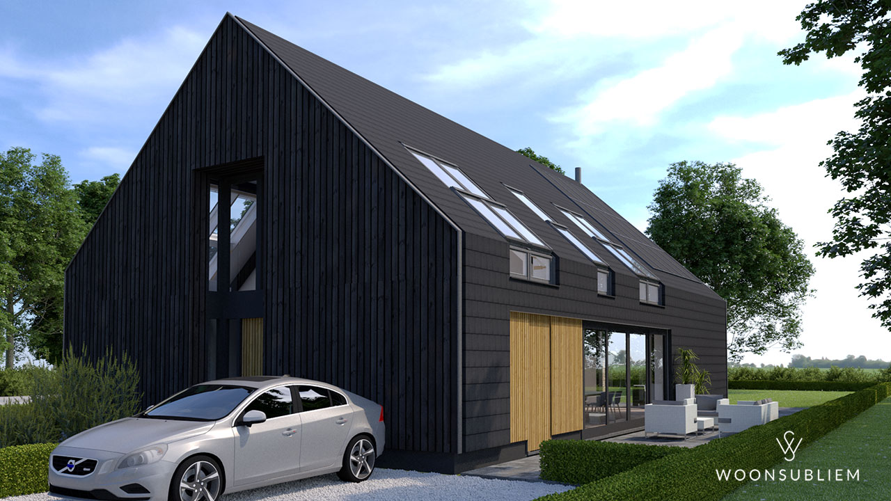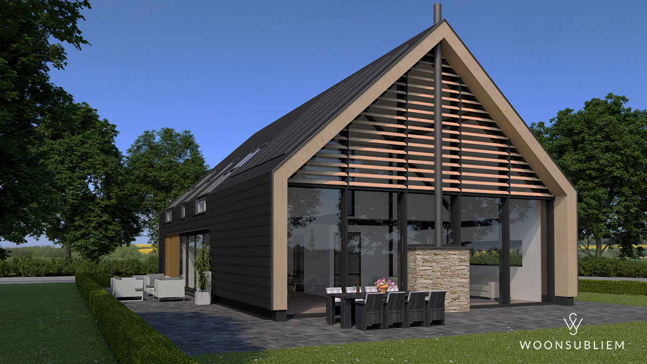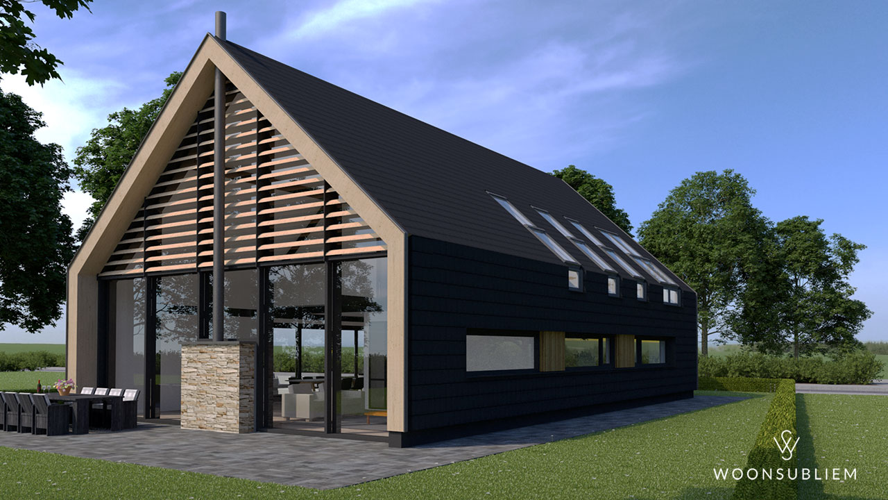 “Een schuurwoning, maar dan wel lekker modern”. In de basis een eenvoudige zuivere vorm, door de toepassing van een constructieprincipe van stalen spanten en prefab buitengevels ontstaat er een zeer flexibel in te vullen woonhuis. Het front is geheel bekleed met hout. De zijwanden zijn bekleed met dakpannen en de achtergevel is volledig van glas.
