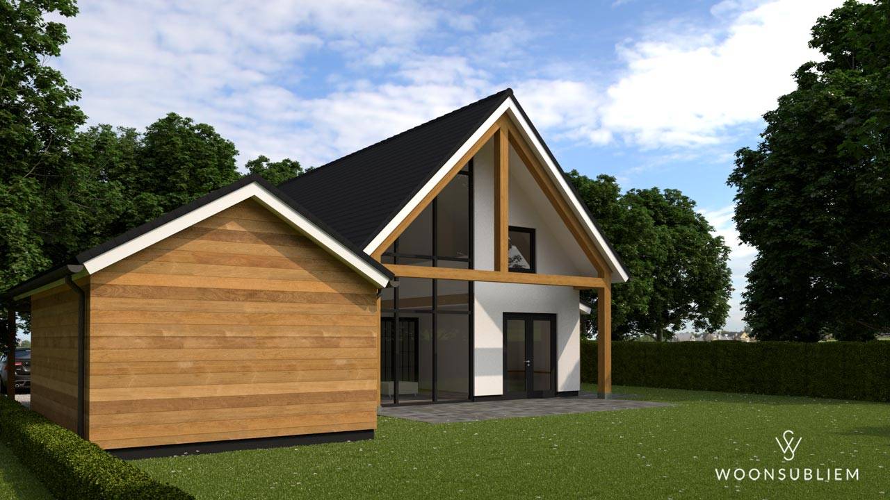 Aan de achterzijde van de kavel bevindt zich een fantastisch uitzicht over het buitengebied van Almen. Er is voor gekozen om aan deze zijde een veranda te maken om er goed van te kunnen genieten. Onder de overkapping is door toepassing van stucwerk er voor gekozen om een witte accentkleur aan te brengen. Grenzend aan deze veranda bevindt zich de woonkamer, waar door een mooi vide beneden én boven dit uitzicht te ervaren is. De doorgaande pui aan de achterzijde geeft een grote hoeveelheid daglicht tot diep in de woning.
