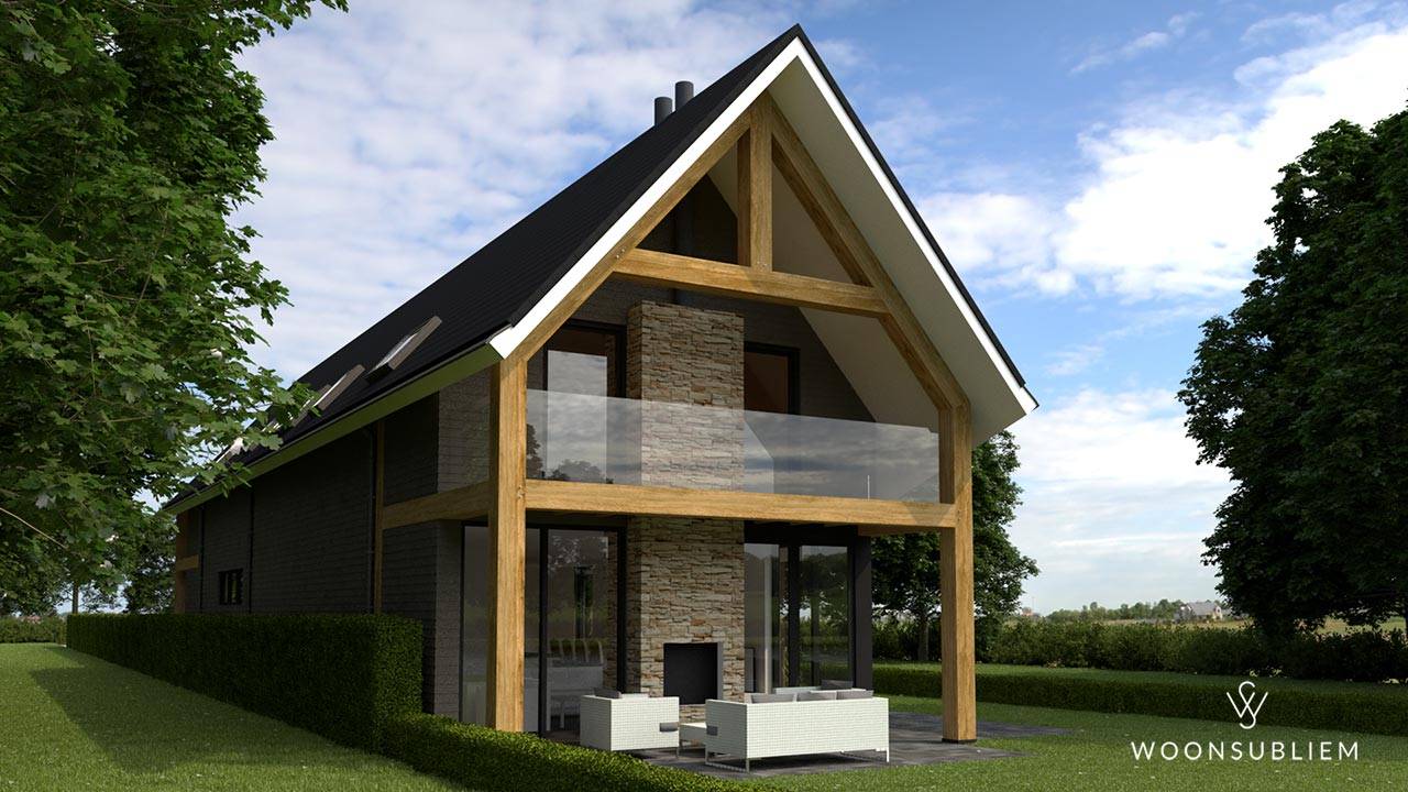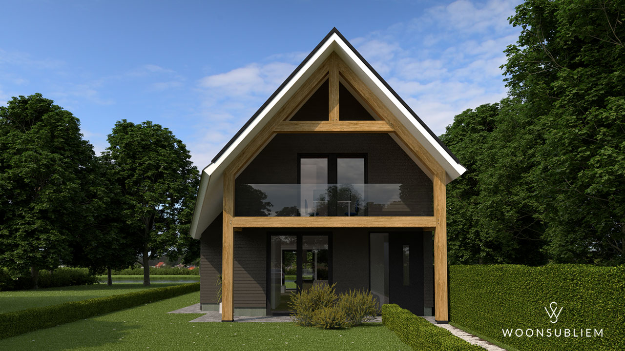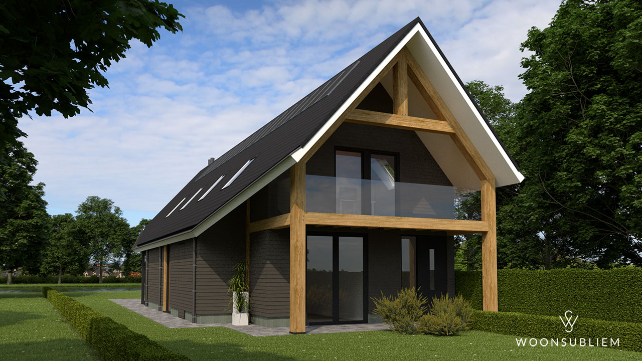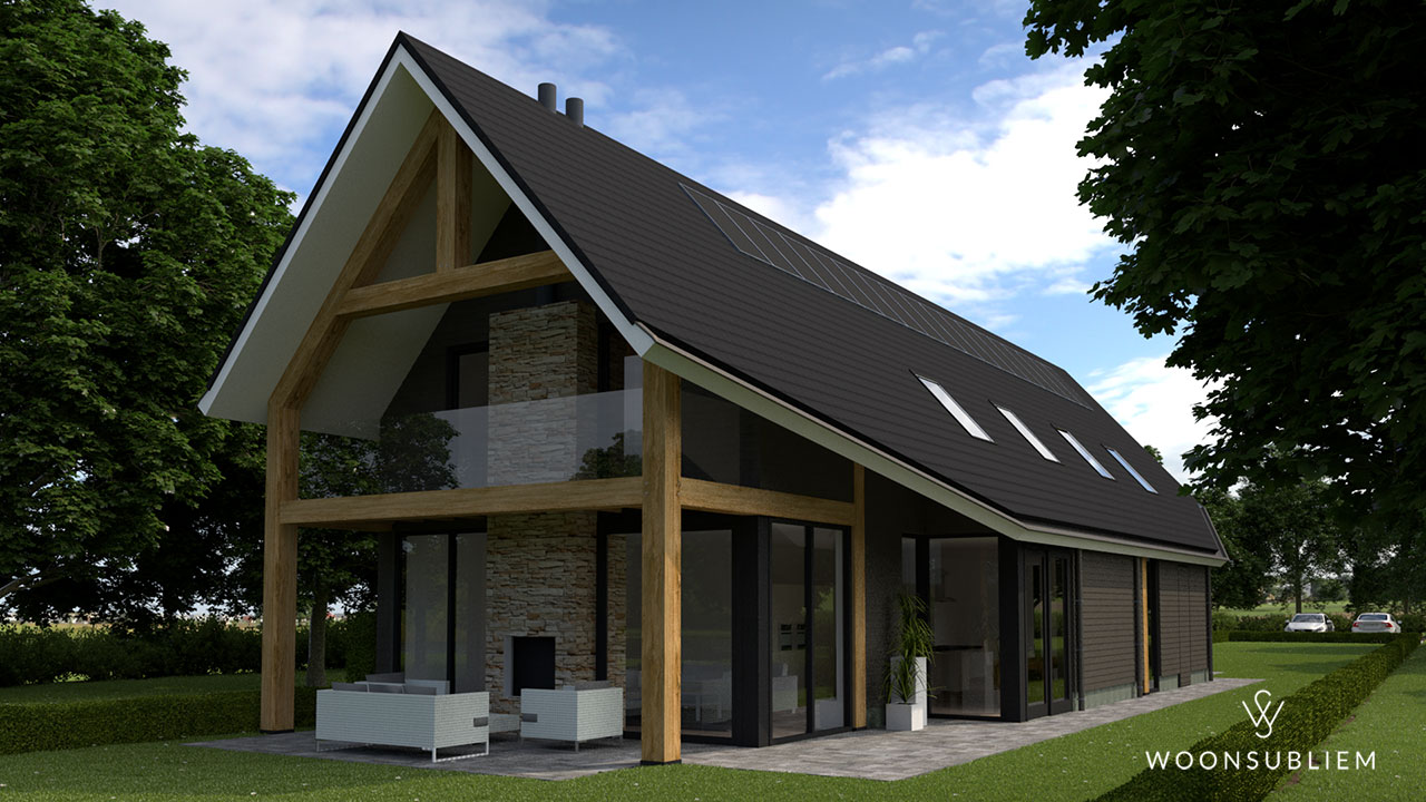 De natuurlijke ligging van deze woning wordt versterkt door de materialisering: donkere houten planken, naturel houten eiken spanten en glas. De open ruimten en vides zorgen voor een verrassende lichtval in dit woningontwerp.