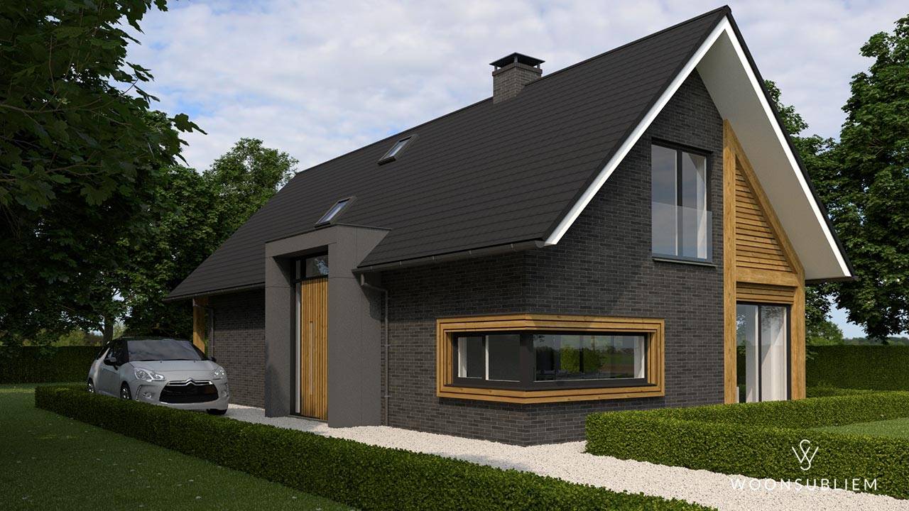 De hoofdvorm heeft een grote kap vorm met grote overstekken, waaronder de gehele schuurwoning wordt “gevangen”. Tevens is er ter plaatse van de entree een accent gemaakt door de voordeur met een glas element te verhogen. De dakkapel aan de andere zijde is doorgezet tot op de begane grond om zo de heldere opzet te waarborgen.