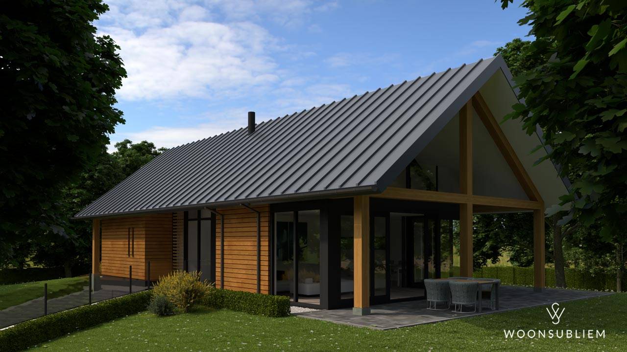 Het overstek van het dak aan beide zijden geeft extra beschutting terwijl de toepassing van een royaal bemeten glasoppervlak zorgt voor genoeg licht-inval en transparantie.