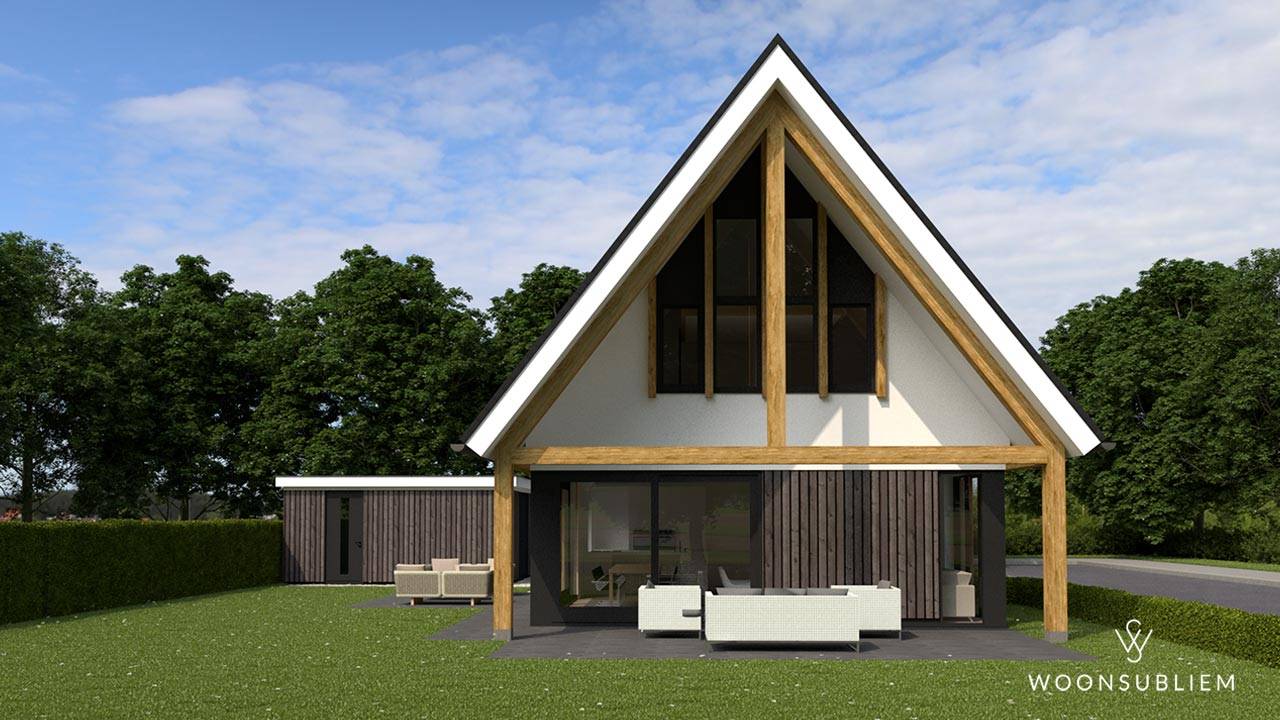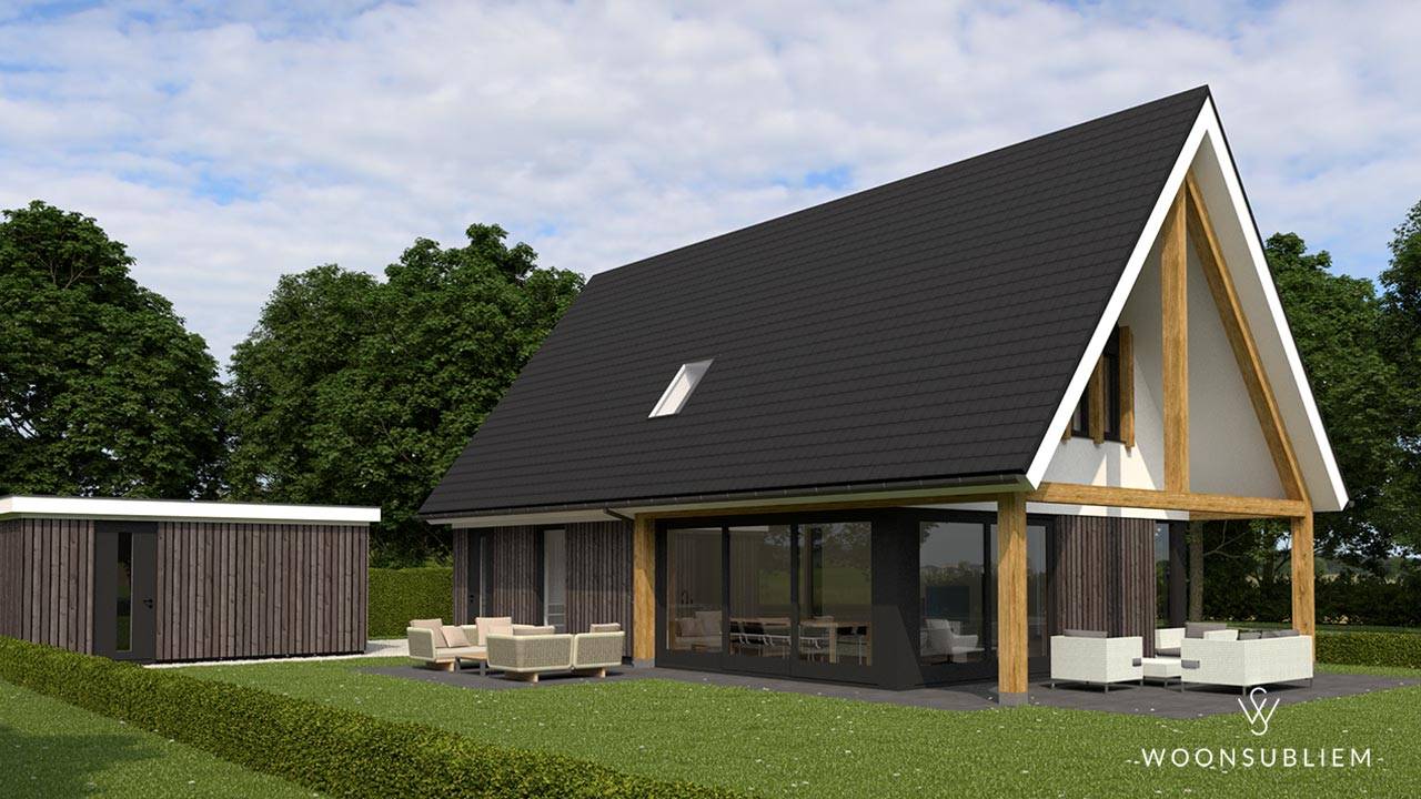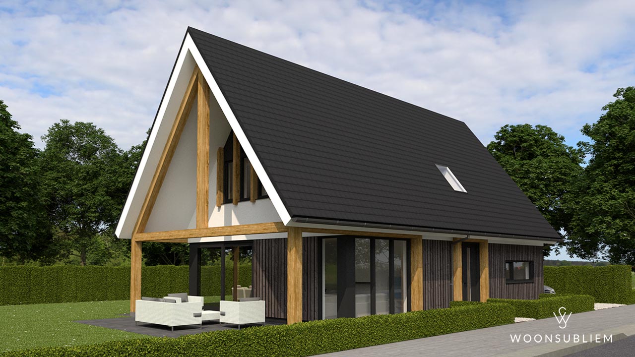 Op een locatie in Zevenaar aan de rand van een nieuwbouwwijk heeft WoonSubliem voor een klant een eigenzinnige schuurwoning ontworpen. Het donkere basement, uitgevoerd in donker hout, krijgt een bovenbouw van een luchtig, wit stucwerk. Hierdoor ontstaat er een frisse en moderne opzet. Door toepassing van houten spanten, uitgevoerd in een transparante houtkleur, die doorlopen in de zijgevels worden klassieke details verweven met een eigentijdse oplossing. Als extra houtaccent zijn er op de verdieping tussen de kozijnen houten balken mee ontworpen.