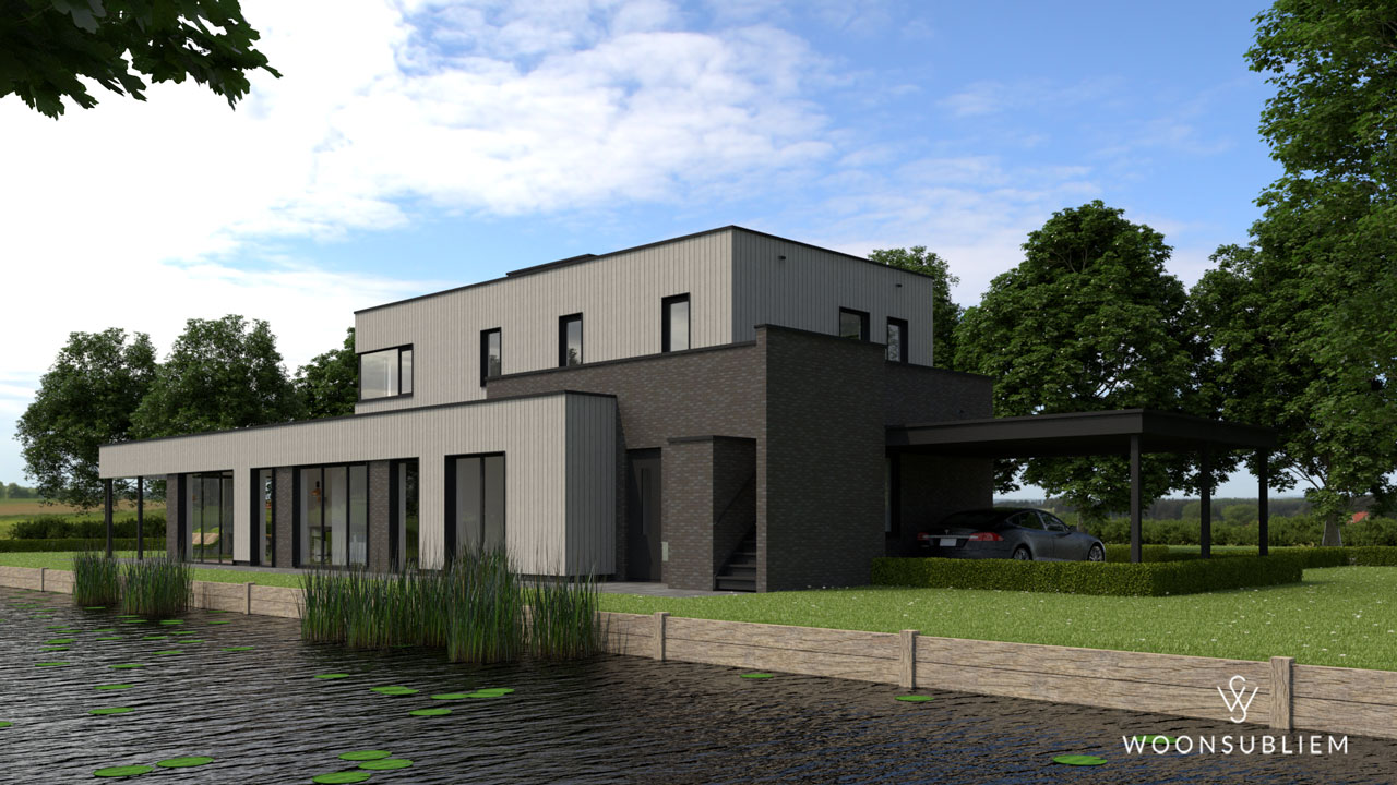 Het kavel met een trapeziumvormig oppervlakte vormt een extra uitdaging voor opdrachtgever en ontwerper. Mede doordat de achterzijde van het kavel grenst aan een grote waterrijke omgeving vraagt dit kavel om een specifiek ontwerp. Het is dan ook een villa geworden die zijn kracht ontleend aan een helder lijnenspel, gebruikmakend van de omgeving.