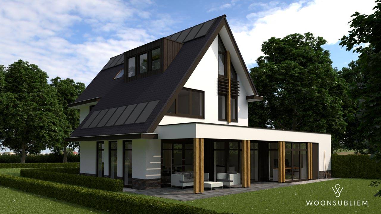 Voor het dak is gekozen om een speels oplopende kap toe te passen die asymmetrisch is en aan de zuidzijde doorloopt tot aan de eerste etage. Dit is ook op het gebied van duurzaamheid erg prettig omdat het voldoende mogelijkheden biedt voor het plaatsen van zonnepanelen. Deze speelse kapvorm versterkt de open structuur van de wijk en de verspringende woningplattegrond volgt de lijnen van de kavel.