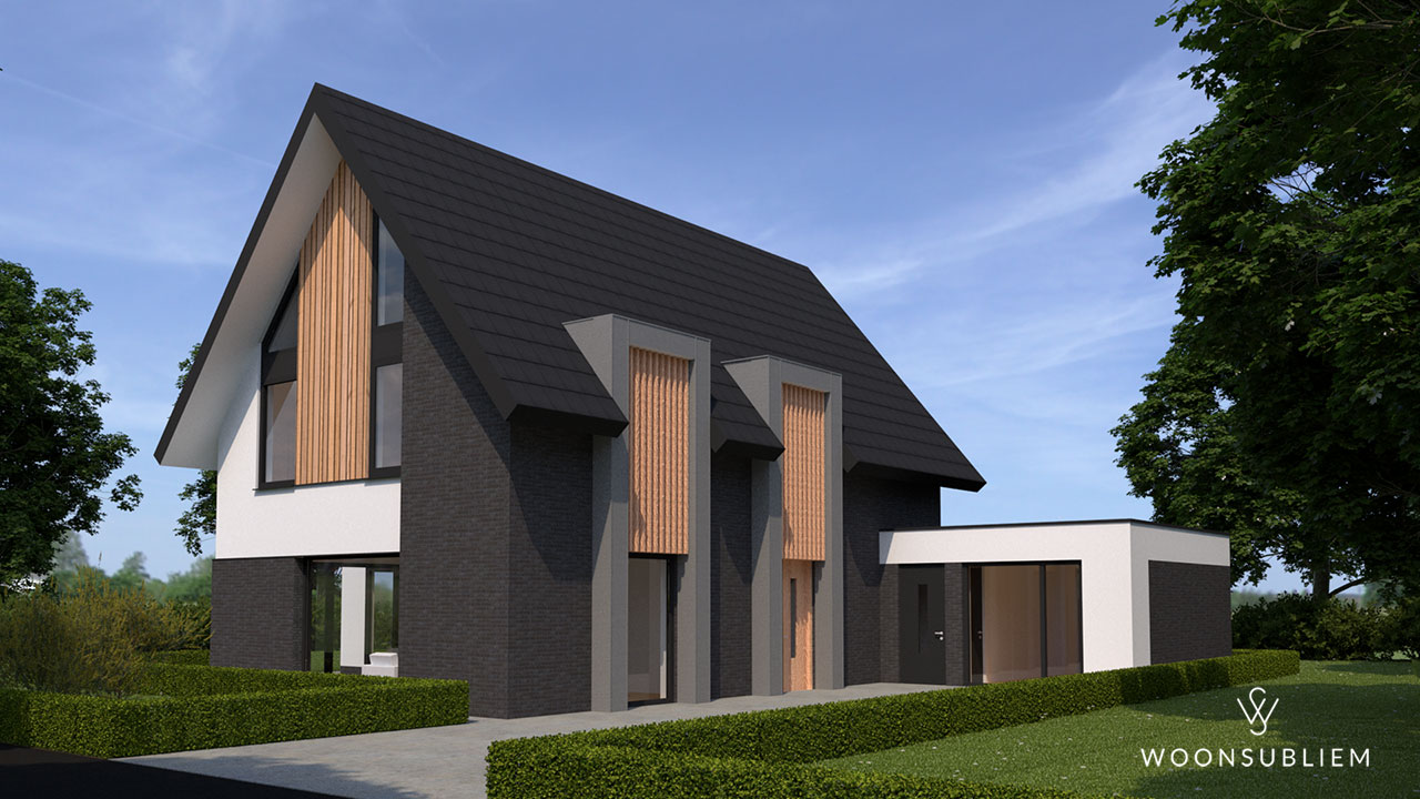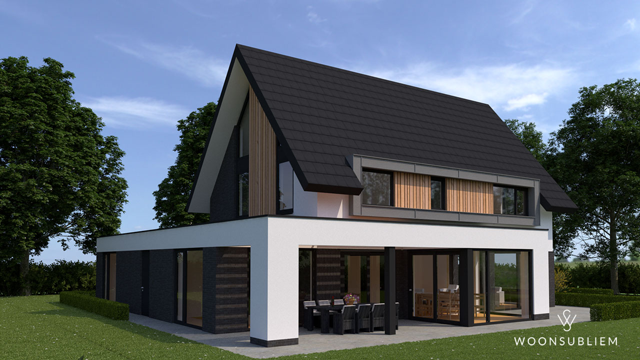 De platte aanbouw die de woning omarmt, herbergt aan de zuidgevel een riante beschutte veranda. Het ontwerp van de glazen puien en de wit gestucte veranda dragen bij aan een open uitstraling van de zuidgevel van dit woningontwerp.