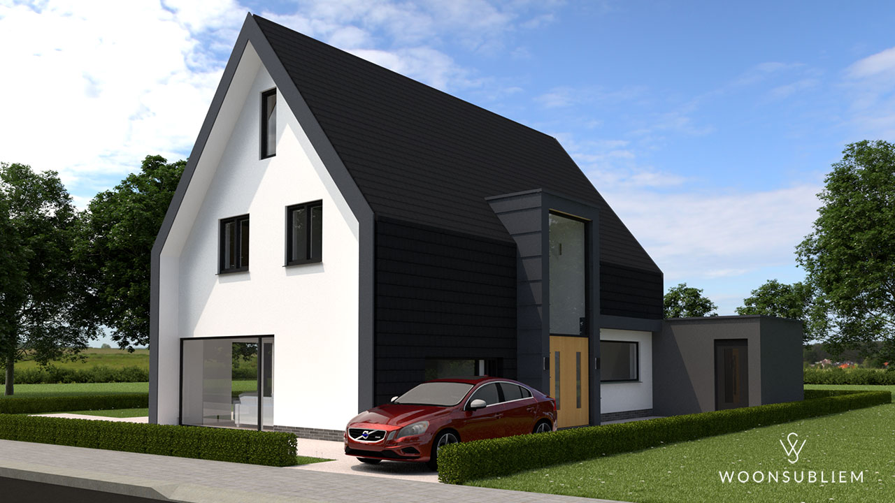 De wens van de opdrachtgever was om een vrijstaande woning in alle eenvoud te ontwerpen, zonder dat het een saai uiterlijk zou krijgen. De ontwerper stelde daarop voor om de dakafwerking door te zetten op de gevels. Mede door dit consequent doorvoeren, dus ook de overstekken, ontstaat er een zeer krachtige vorm. Door de kopgevels in een frisse witte kleur uit te voeren wordt de vormgeving versterkt.