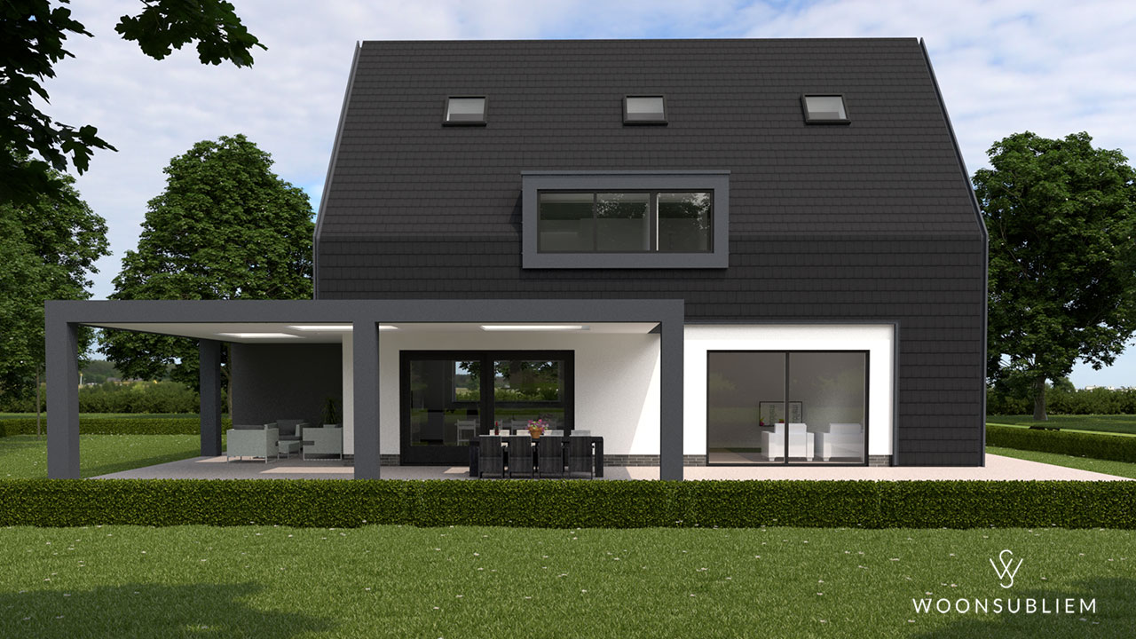 Ondanks de lagere kniklijn in het dakvlak, is er toch een ontwerp ontstaan met veel inhoud. Op verdieping en zolder zijn in totaal 5 slaapkamers en 2 badkamers gerealiseerd. Het wonen op de begane grond wordt “naar buiten” doorgezet door het overdekte terras. Om toch voldoende licht binnen te behouden zijn hierin enkele daklichten verwerkt.