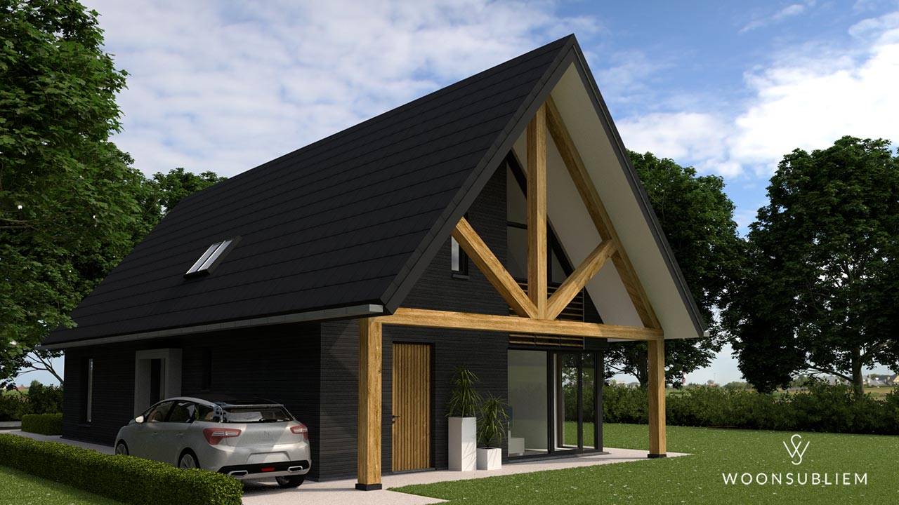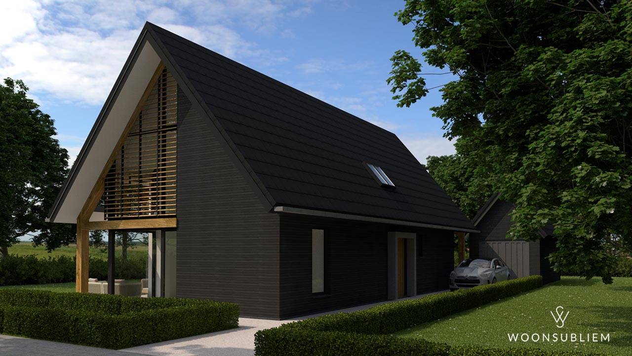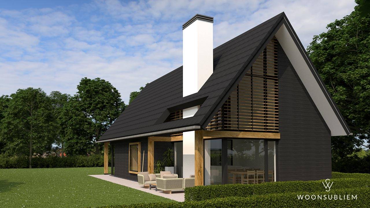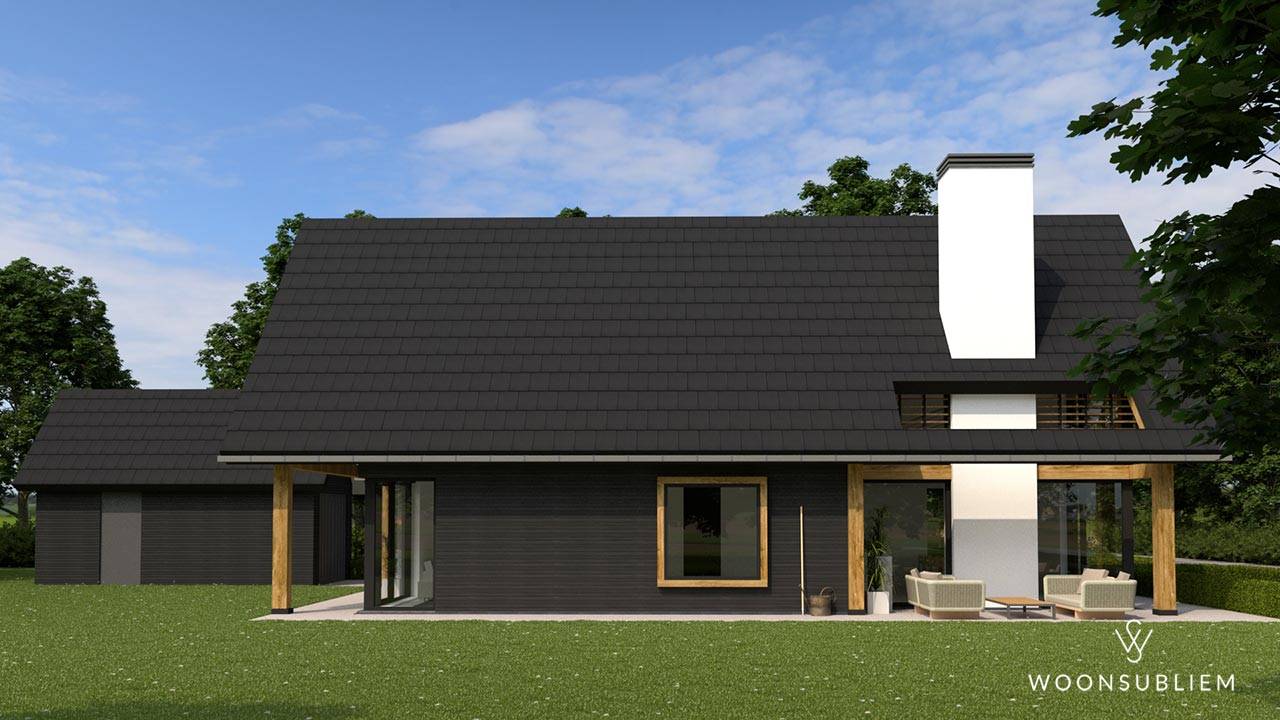 Achterin de woning ligt de woonkamer, een beetje verscholen, waardoor deze een eigen ingetogen en intieme sfeer krijgt. Het houten spant geeft deze zijde van de woning karakter en beschutting door het grote overstek van het dak.