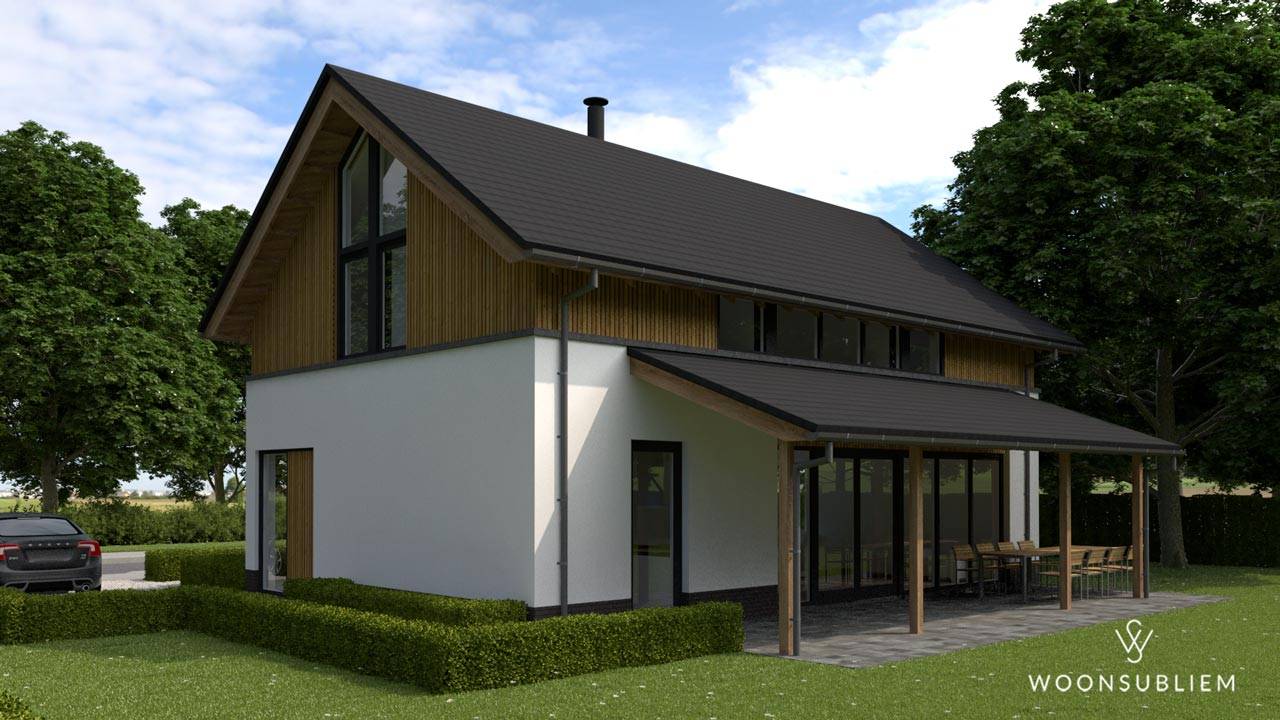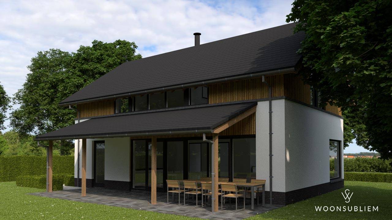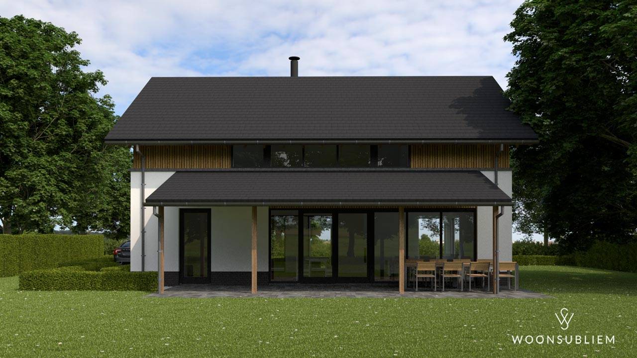 De combinatie van wit stucwerk, naturel hout en het antraciete dak & kozijnen zorgen voor een rustig geheel, waarbij de raampartijen als grote vlakken zijn vormgegeven.
