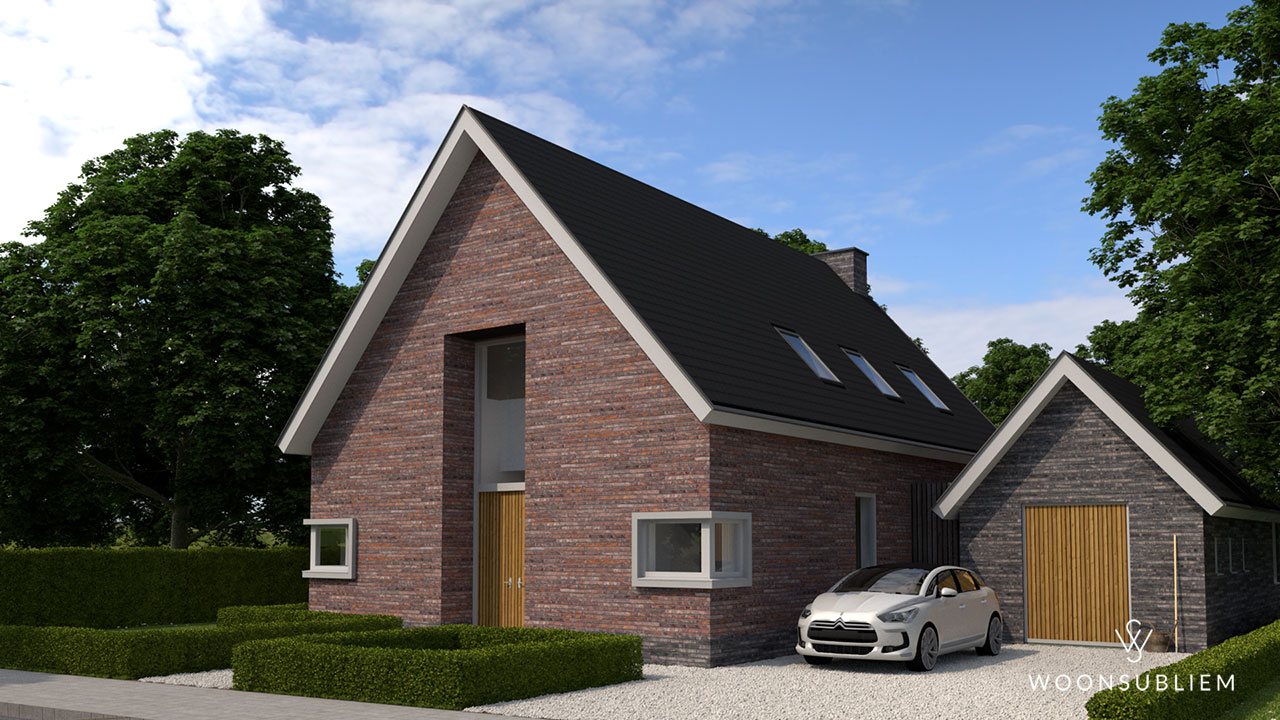 Voor deze kavel hebben we een moderne vrijstaande woning ontworpen met een zadeldak in combinatie met een bijgebouw. Aan de voorzijde is de grote opening een beeldbepalend element: Hier bevindt zich de entree en op de verdieping een entresol met atelier en expositieruimte.