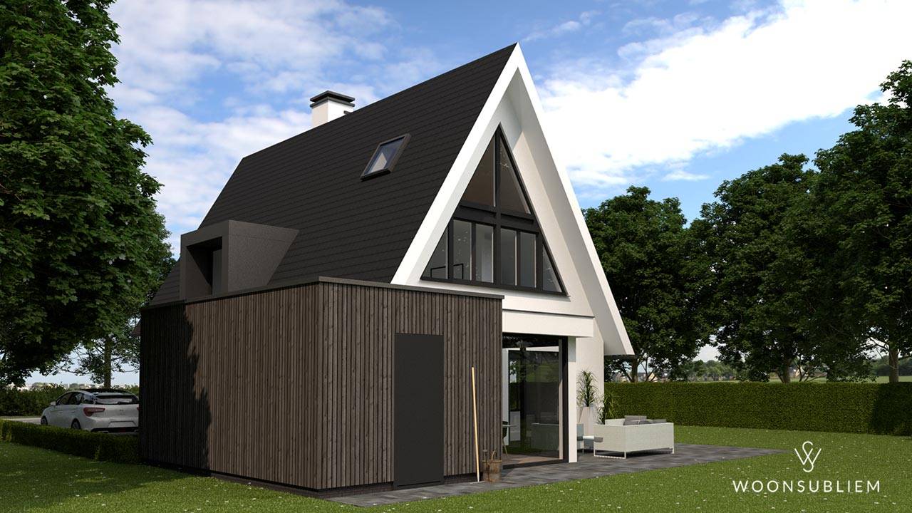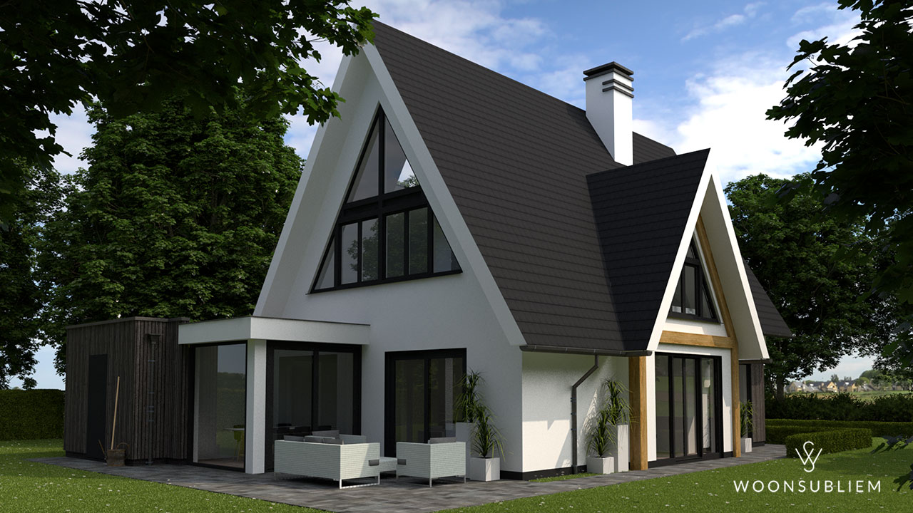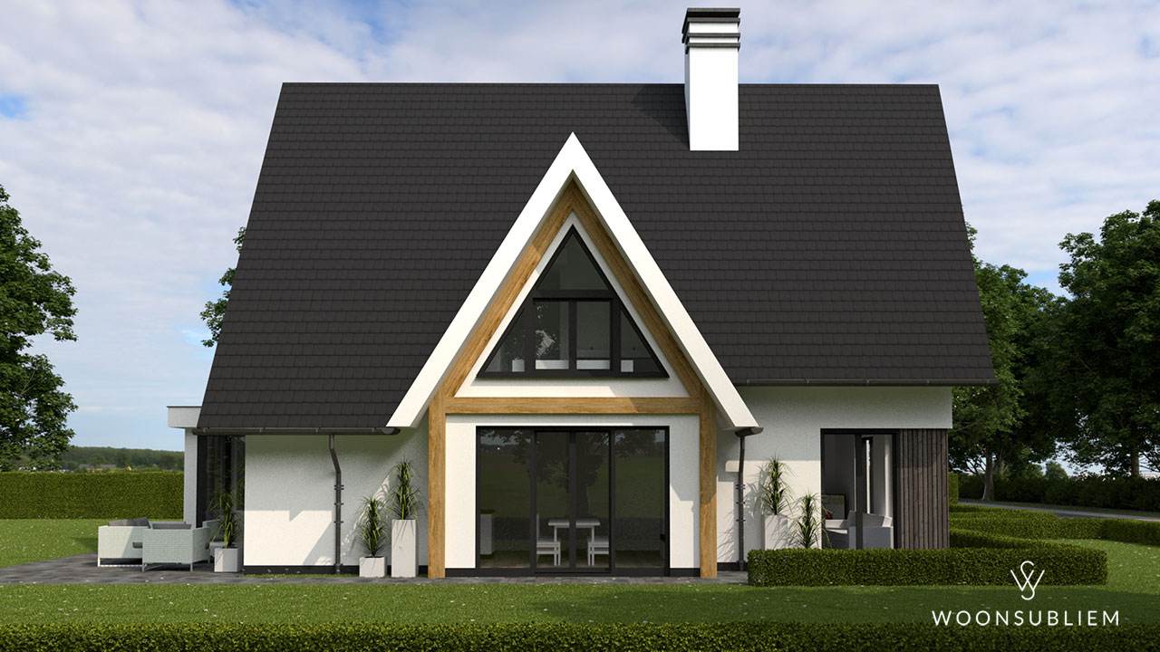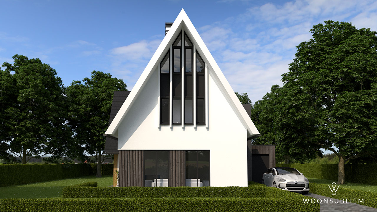 De grote gevelopeningen geven de vrijstaande woning zowel van binnen als van buiten een zeer vriendelijk “gezicht”. De driehoekige verdiepingskozijnen in zij- en achtergevel zorgen voor een herkenbaar aanzicht. Alle woonruimten krijgen door deze indeling een zeer lichte plek om zo ook van de tuin en de omgeving te kunnen genieten.