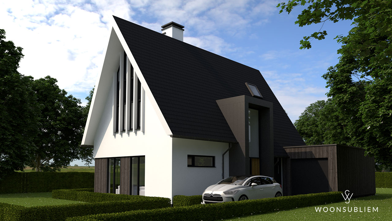 Deze traditionele bouwvorm heeft door verschillende onderdelen een verfrissend beeld gekregen. De kapvorm is bijzonder door toepassing van een scherend overstek en steile vorm. Zo ontstaat er een zeer krachtige vorm. Door het hoofdgebouw in wit stucwerk uit te voeren en het bijgebouw in hout wordt dit beeld versterkt.