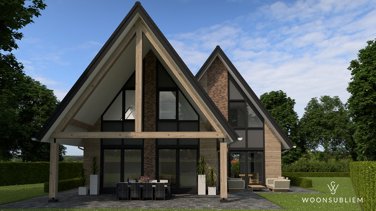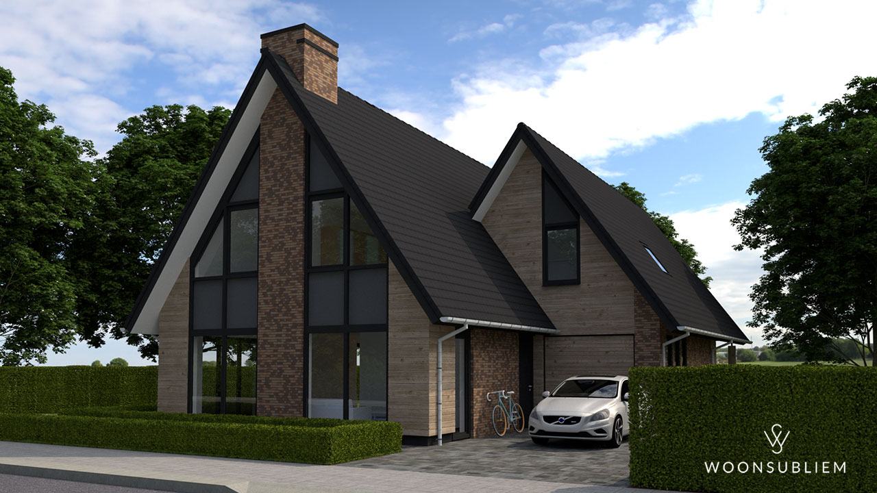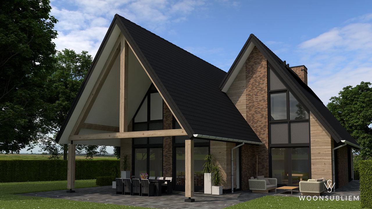 Warme bruine stenen in combinatie met hout vormen de basis van deze woning. Het gebruik van zwarte aluminium kozijnen maakt de luxe afwerking compleet. De zwarte en vlakke keramische dakpannen liggen als een deken over beide kappen.